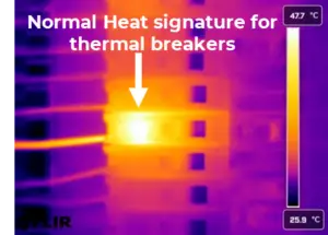 For Example the breaker on the left produces a thermal heat signature consistent with a normal operating breaker. The breaker on the right however does have an issue, even though it is cooler then the breaker on the left. Notice how the heat source is focused on the wire termination. This issue can likely be fixed with a few turns of a screwdriver.